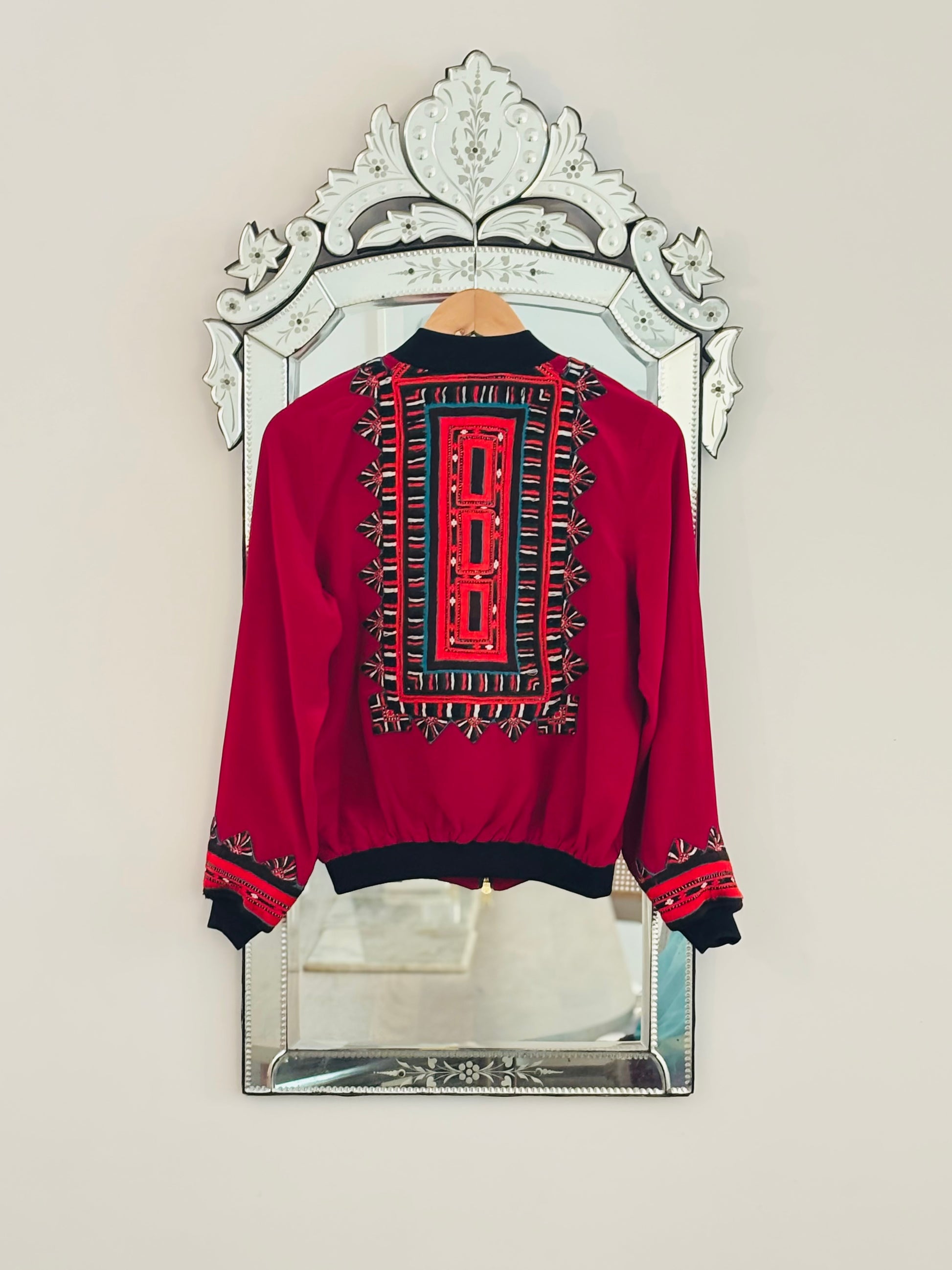 Fruto da colaboração entre a designer francesa Olivia Dar e Aneek W, esta jaqueta up cycled em crepe de seda pura é uma peça única que carrega histórias e tradição. O destaque é o bordado vintage Baluchi, feito à mão por jovens mulheres antes do casamento, trazendo um toque cultural autêntico. O zíper frontal une praticidade e estilo, enquanto o contraste entre o tecido fluido e os bordados detalhados resulta em uma peça com identidade e alma.