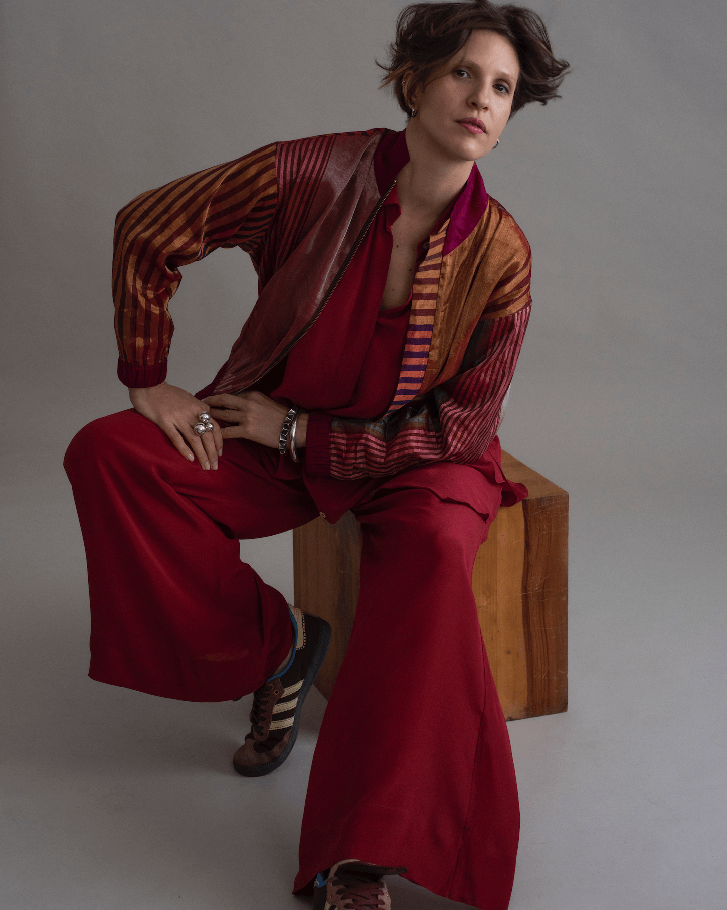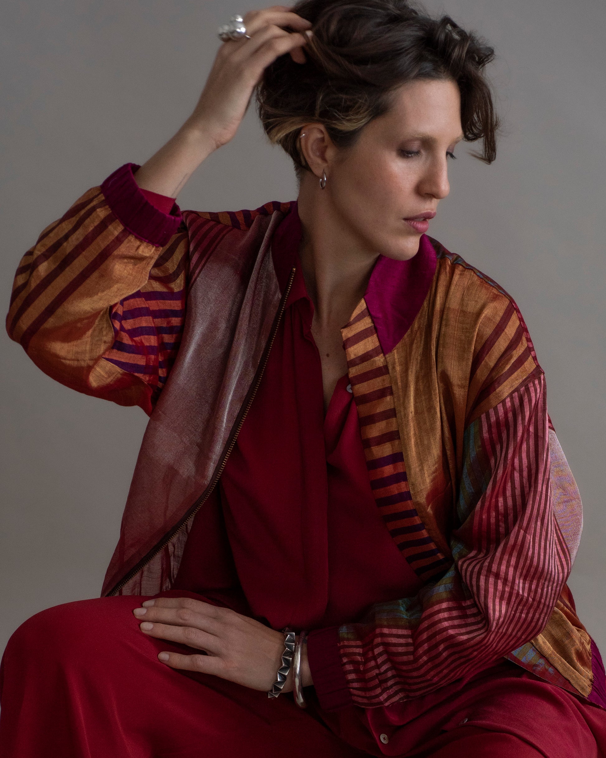 Feita em gaze de seda leve e luminosa, tecida em tear manual, essa bomber recebe o brilho sutil do fio zari, tradicionalmente usado na tecelagem indiana. O trabalho artesanal cria um efeito reluzente que muda conforme a luz, dando profundidade e movimento ao tecido. Originalmente, era produzido com prata e ouro batidos até formar lâminas finíssimas, que depois eram enroladas em torno de um fio de seda ou algodão. Hoje, muitas vezes é feito com ligas metálicas mais leves, mantendo o mesmo efeito luminoso.Ele é valorizado porque acrescenta brilho e profundidade ao tecido sem perder flexibilidade.