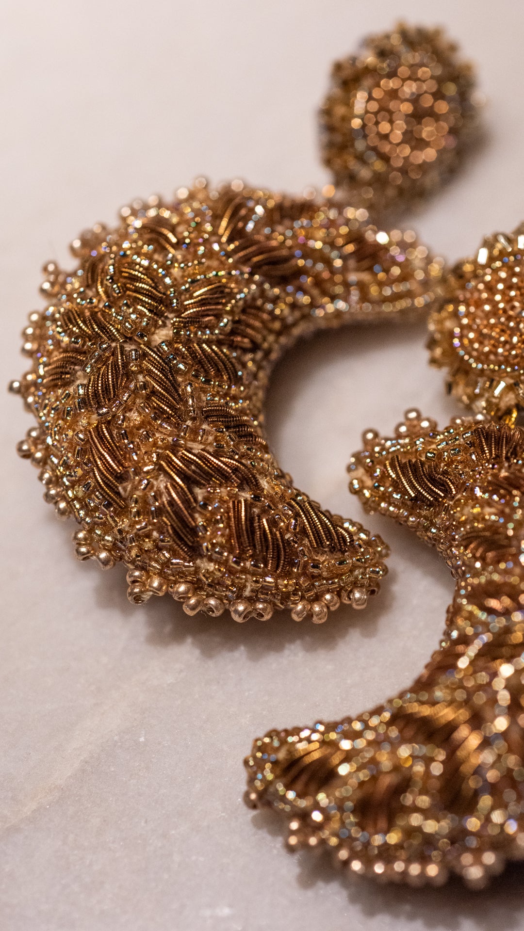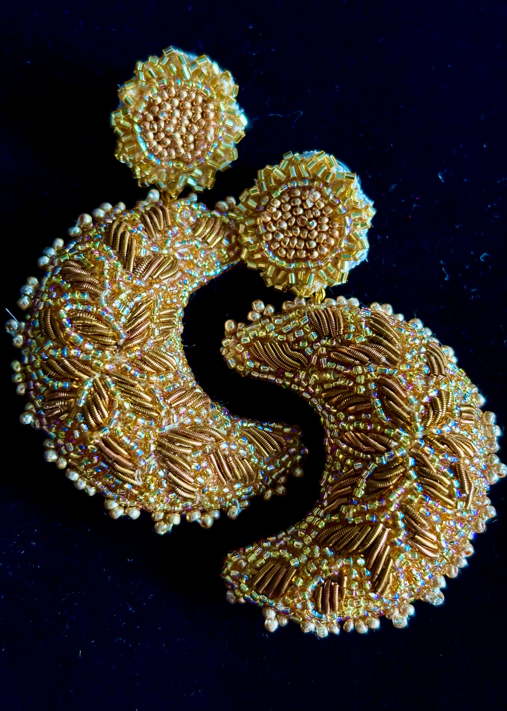 Brincos bordados a mão, com micro miçangas, fio dourado zari e sequins, leves como uma pluma na cor dourado. Um "statement piece" feito com maestria artesanal no studio da designer francesa Olivia Dar em New Delhi, onde experientes artesãos bordam com tradicionais técnicas de bordado indianas.