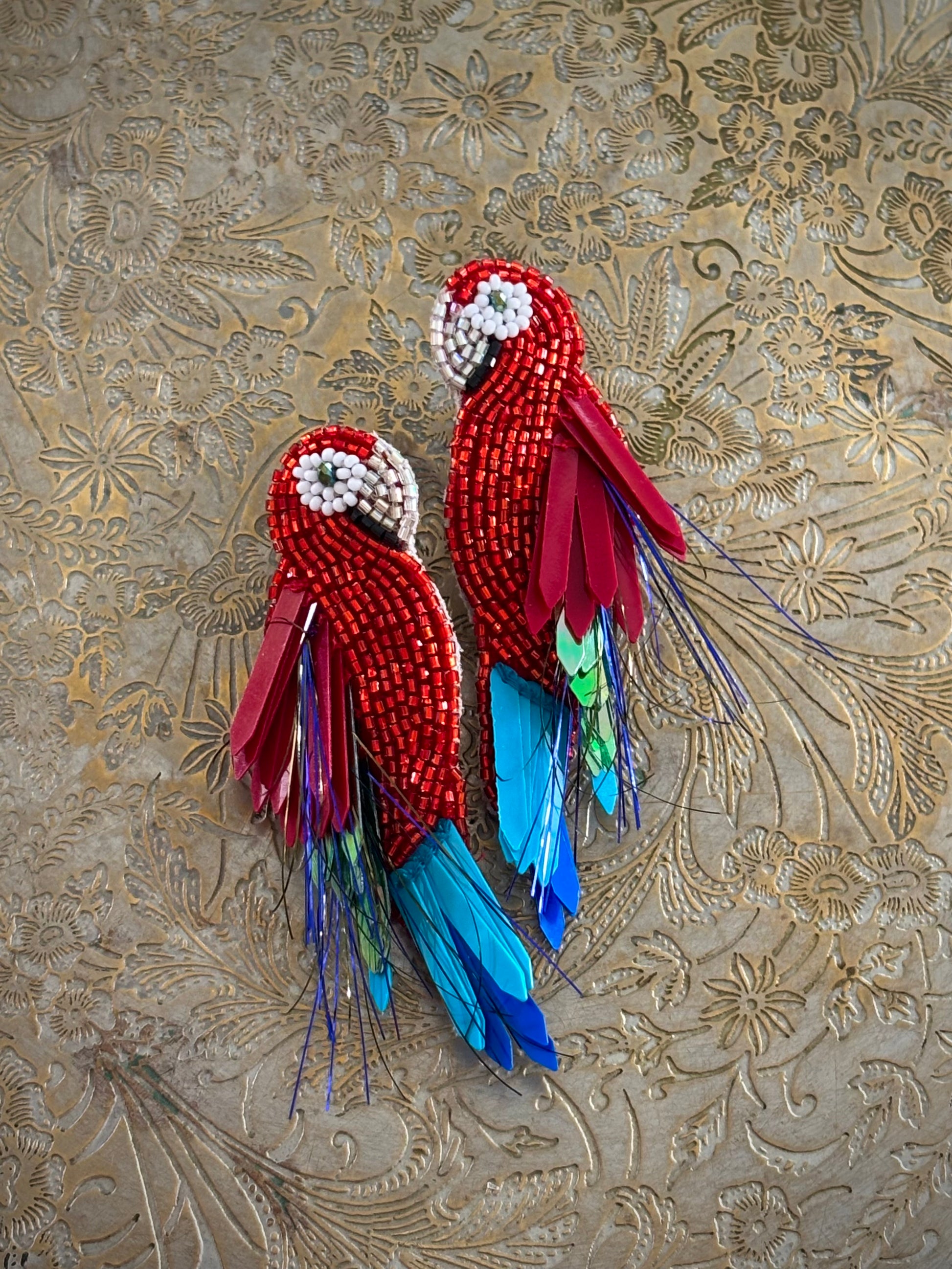Inspirado nas coloridas Araras tropicais , os Brincos ARA são feito com uma combinação de micro miçangas e sequins alongados que imita as penas longas e brilhantes da cauda deste pássaro tão exótico.