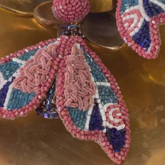 Brincos bordados a mão, com sequins, zari e fios de seda são muito leves. " A statement piece" inspirado na natureza este brinco em forma de concha acrescenta brilho a um look resort. Feito com excepcional maestria artesanal no studio da designer francesa Olivia Dar em New Delhi, por experientes artesãos usando antigas técnicas de bordado indianas.