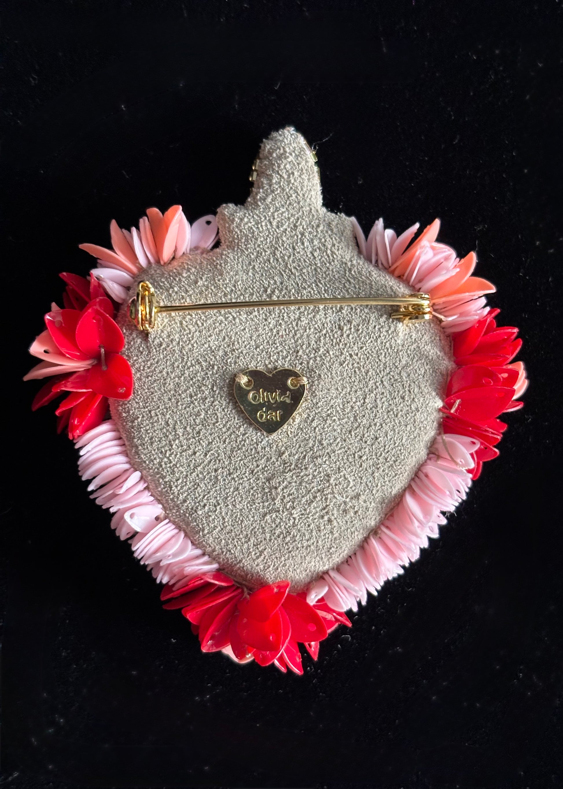 BROCHES bordados a mão, com micro miçangas e sequins em vermelho, rosa e dourado. São um "statement piece" inspirados no tradicional símbolo do Coração Sagrado que encontrados desde a Sicília até o México este broche dá mais brilho ao seu look usado com jaquetas, camisas ou sobretudos. Feito com maestria artesanal no studio da designer francesa Olivia Dar em New Delhi, por experientes artesãos usando antigas técnicas de bordado indianas.