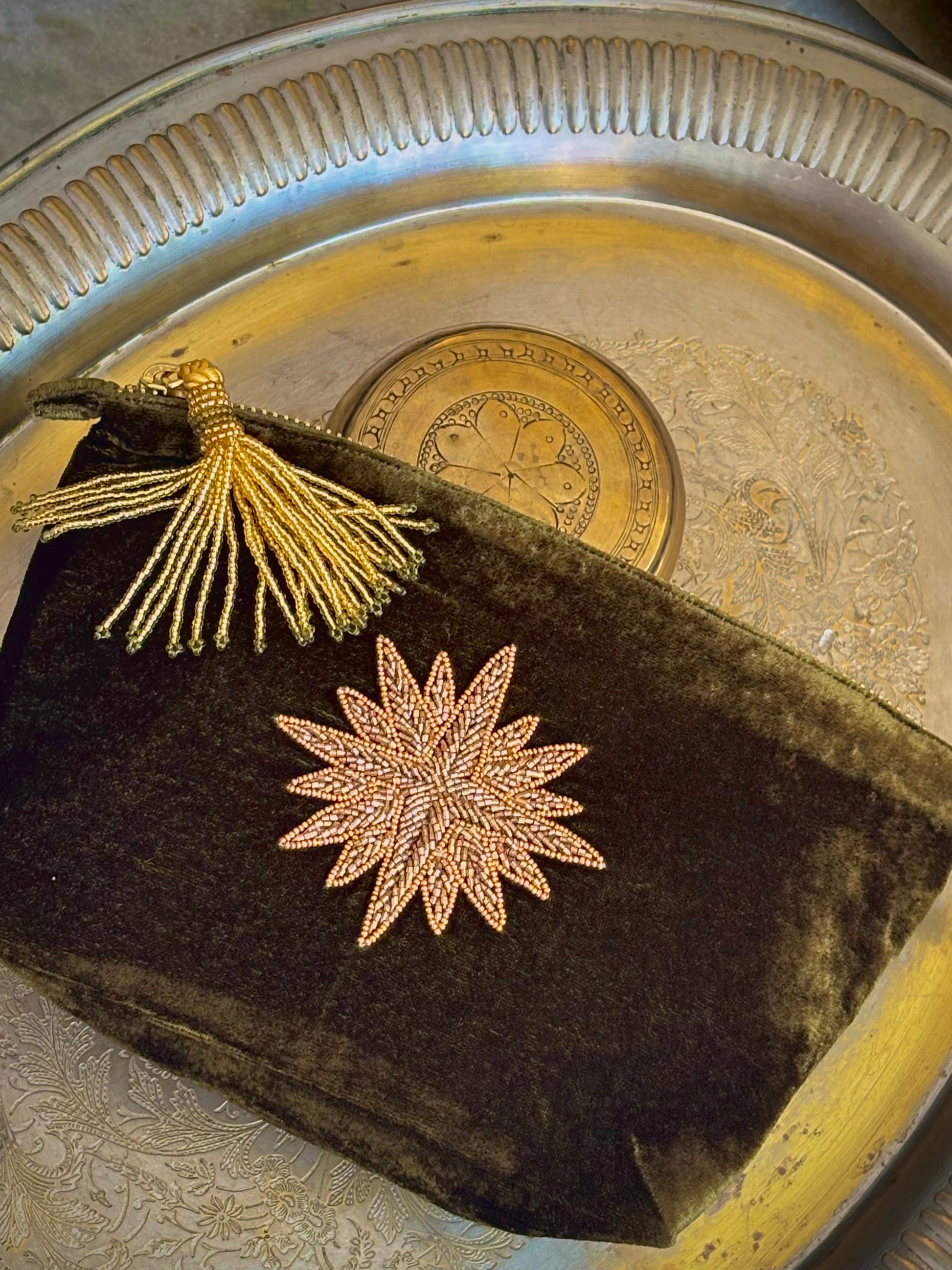 Carteira de veludo bordada á mão com pequenos sequins e canutilhos.