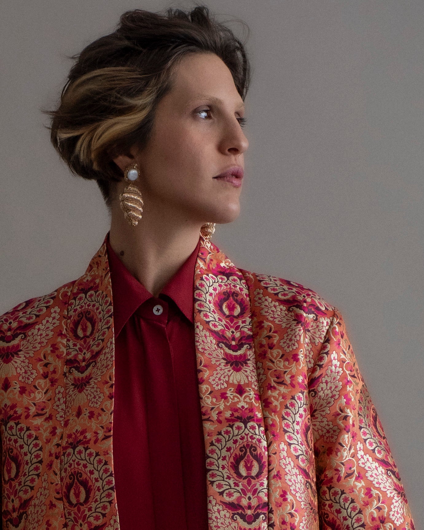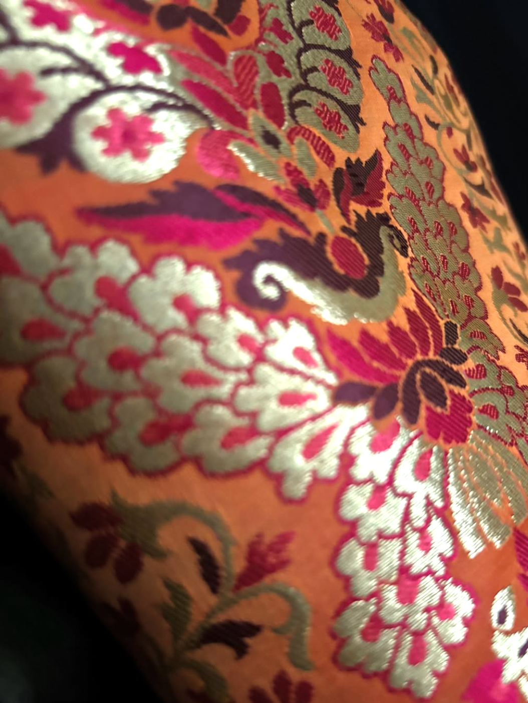 Jaqueta confeccionada em autêntico brocado Benarsi, tecido nobre originário de Varanasi, conhecido por sua complexa trama de fios de seda e desenhos em relevo que refletem séculos de tradição artesanal indiana. Cada peça é meticulosamente cortada e montada para preservar o desenho do brocado, resultando em um casaco de presença marcante e textura rica. O caimento estruturado, aliado ao brilho sutil do tecido, cria uma silhueta imponente e refinada. Um exemplar raro da arte têxtil, destinado a quem busca peças com herança cultural, exclusividade e excelência em cada detalhe.
