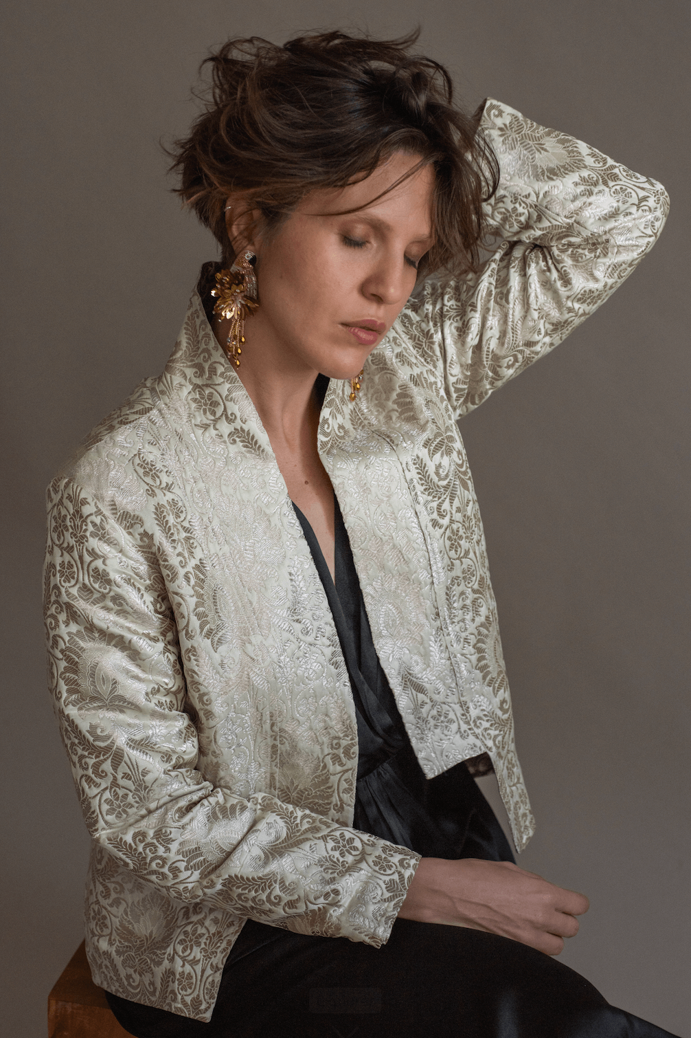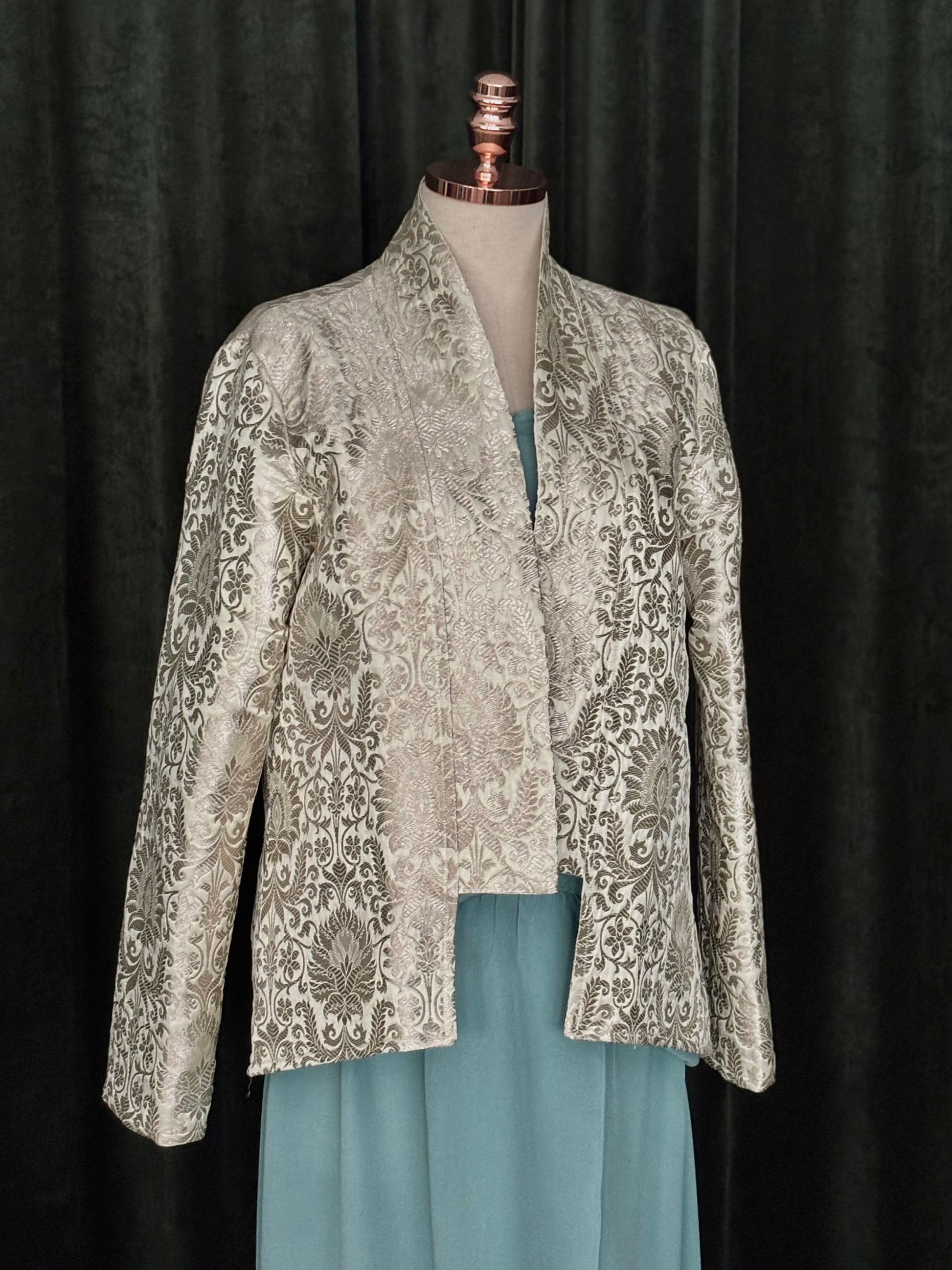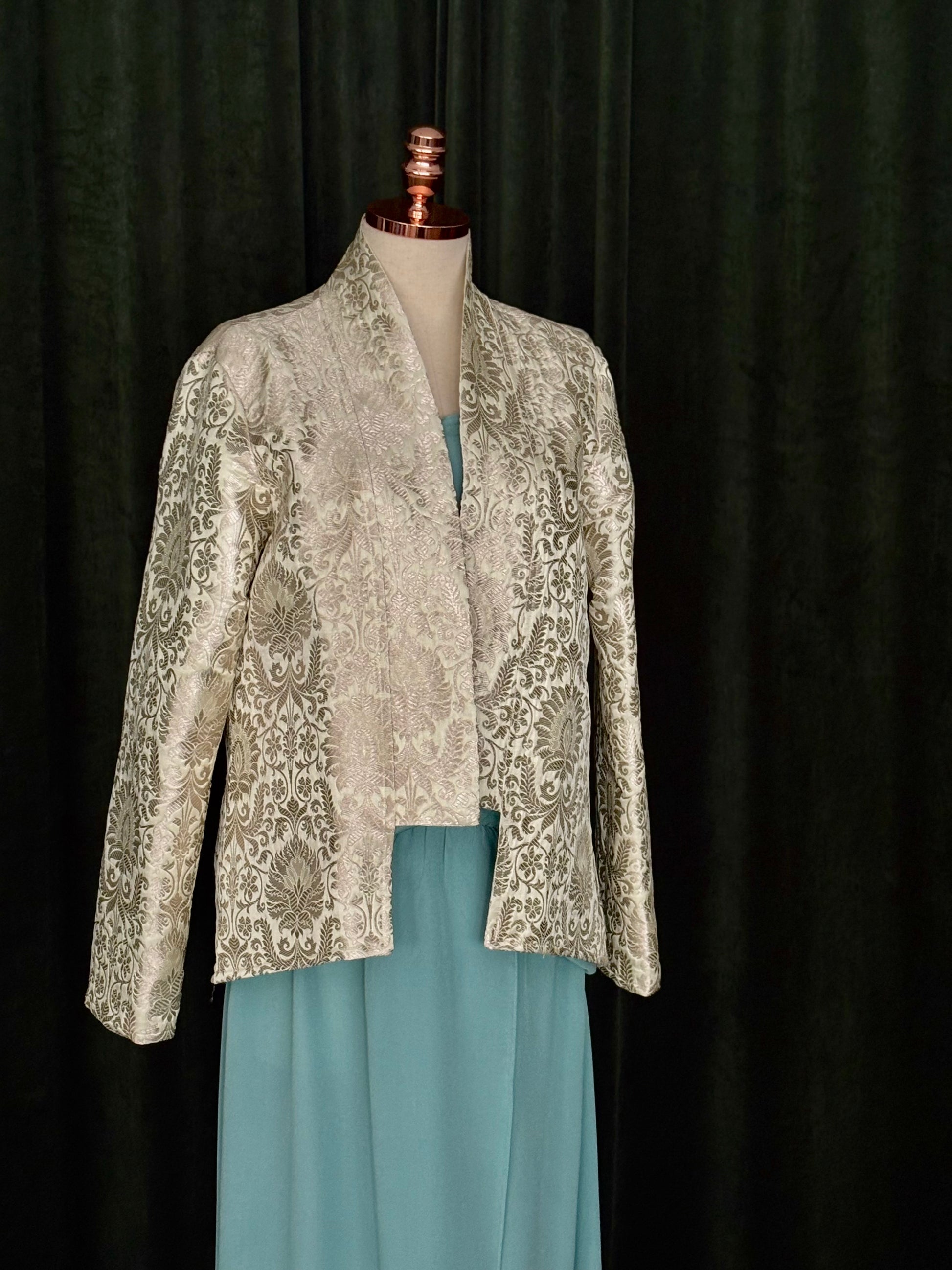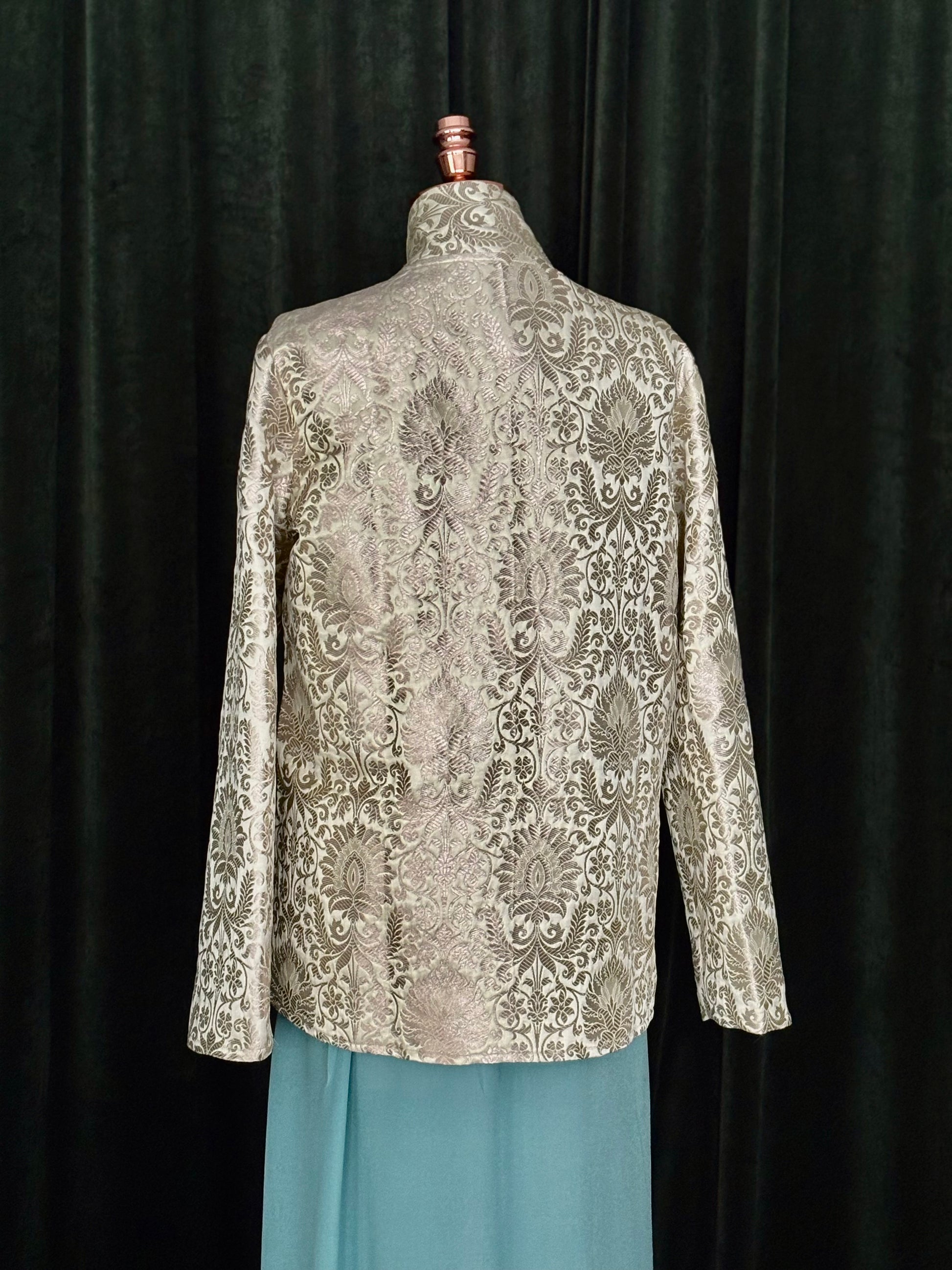 Jaqueta confeccionada em autêntico brocado Benarsi, tecido nobre originário de Varanasi, conhecido por sua complexa trama de fios de seda e desenhos em relevo que refletem séculos de tradição artesanal indiana. Cada peça é meticulosamente cortada e montada para preservar o desenho do brocado, resultando em um casaco de presença marcante e textura rica. O caimento estruturado, aliado ao brilho sutil do tecido, cria uma silhueta imponente e refinada. Um exemplar raro da arte têxtil, destinado a quem busca peças com herança, exclusividade e excelência em cada detalhe.