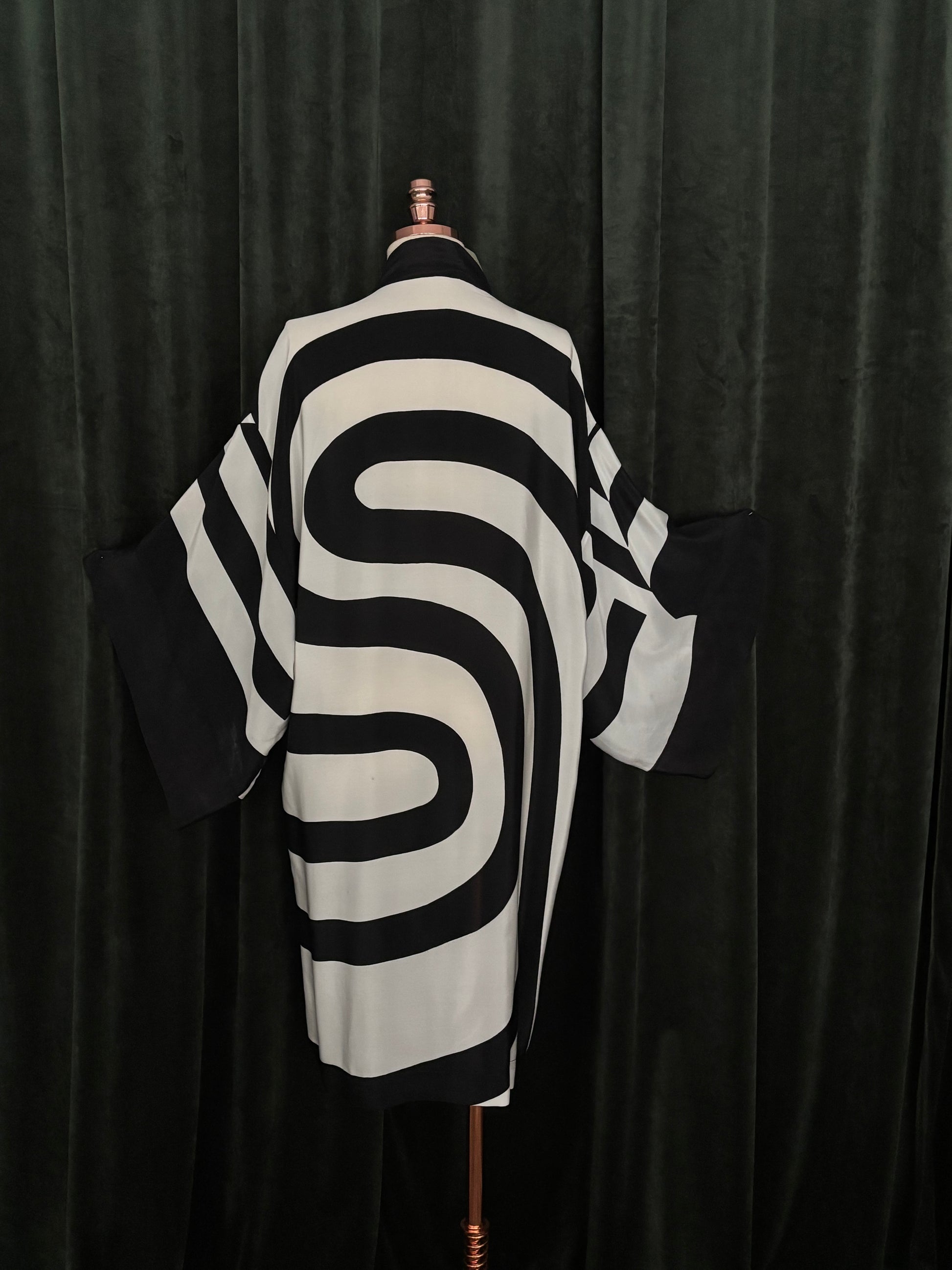 Kimono criado a partir do meu acervo pessoal de saris de seda pura — cada peça é única, tecida com história e transformada manualmente em um novo formato. As estampas geométricas, originalmente desenhadas para saris indianos, ganham nova vida em um corte leve e fluido que valoriza o movimento e o brilho natural da seda. Um trabalho de ressignificação que une tradição, raridade e arte têxtil em uma criação exclusiva, feita para quem reconhece o valor do que é realmente singular.