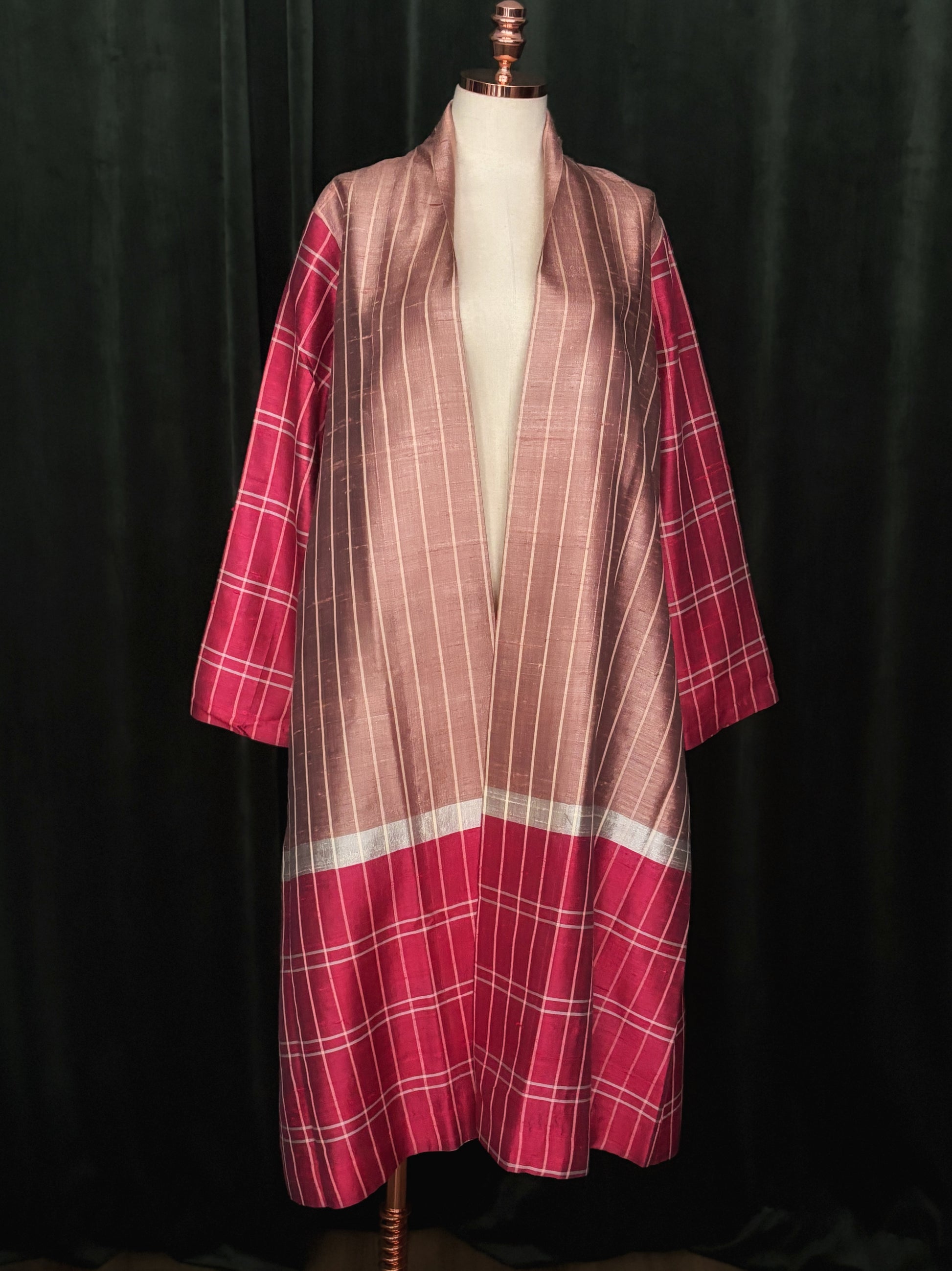 Overcoat em seda Tussar, de textura leve e brilho discreto. As listras assimétricas trazem movimento ao desenho, enquanto os bolsos embutidos mantêm o corte limpo e preciso. Uma peça versátil, de presença sutil e acabamento impecável.