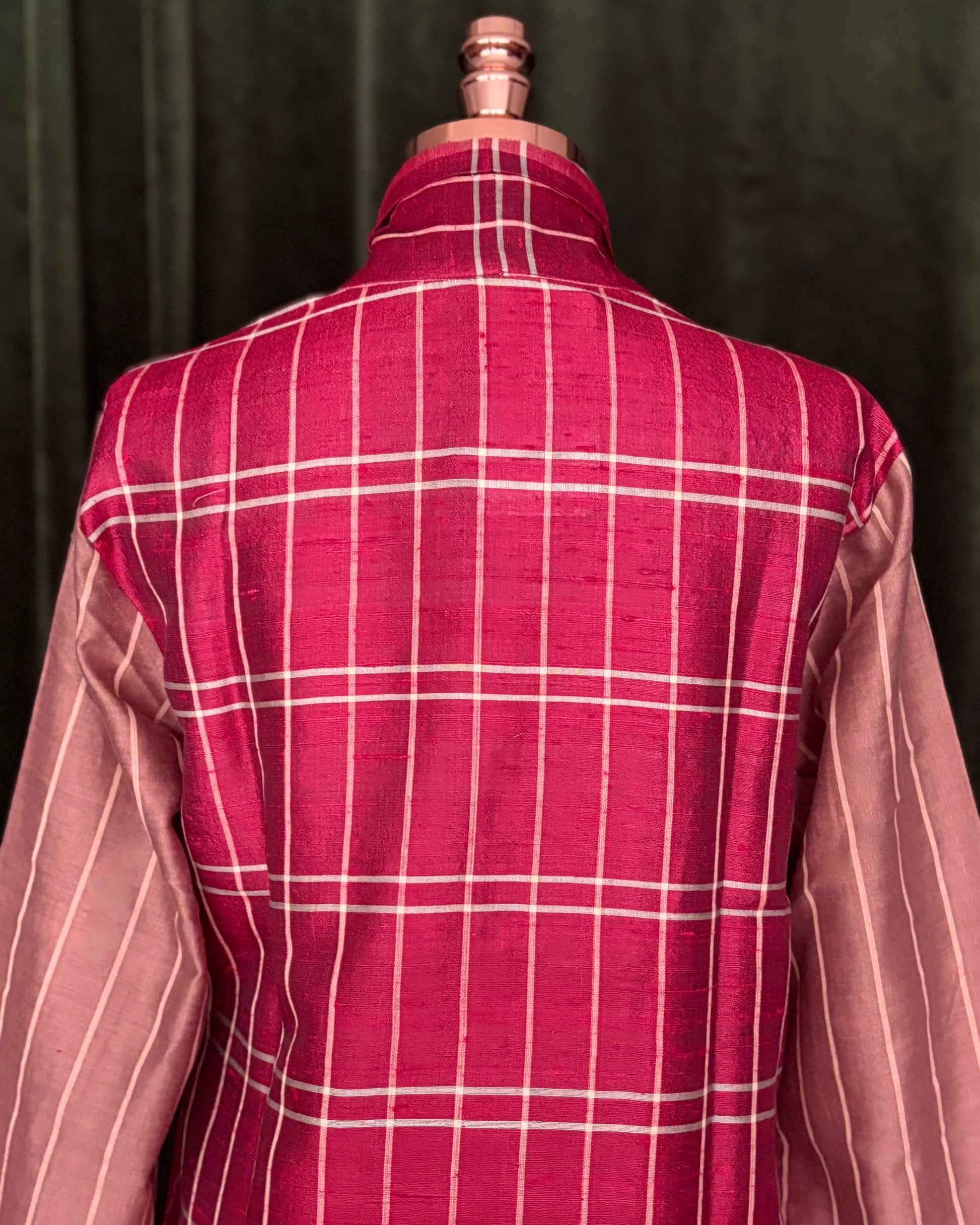 Overcoat em seda Tussar, de textura leve e brilho discreto. As listras assimétricas trazem movimento ao desenho, enquanto os bolsos embutidos mantêm o corte limpo e preciso. Uma peça versátil, de presença sutil e acabamento impecável.