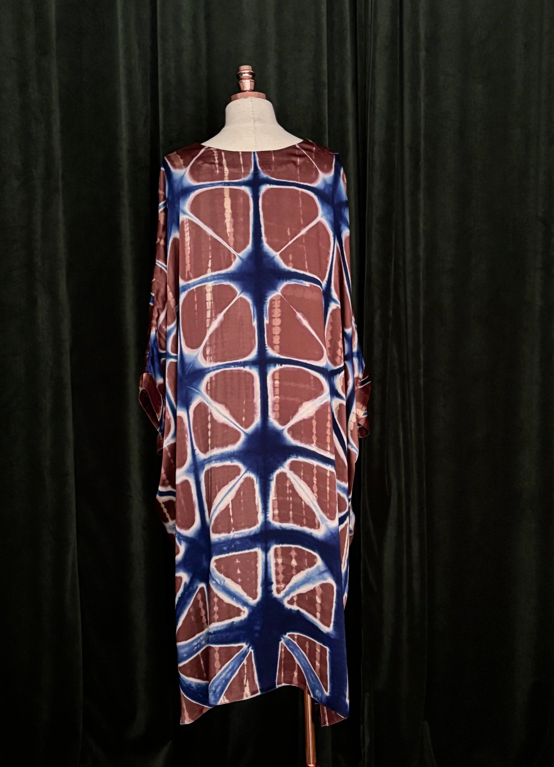 Kaftan em cetim de seda, com estamparia shibori inteiramente feita à mão — técnica ancestral japonesa que cria desenhos orgânicos e únicos através do tingimento artesanal. Cada peça é exclusiva, resultado de um processo lento e preciso que revela nuances sutis de cor e textura sobre o brilho delicado do cetim. O corte fluido, de linhas amplas e elegantes, valoriza o movimento e o cair perfeito da seda, criando uma presença serena e sofisticada. Uma peça de arte têxtil contemporânea, destinada a mulheres que apreciam o luxo discreto do feito à mão e a autenticidade das tradições artesanais.