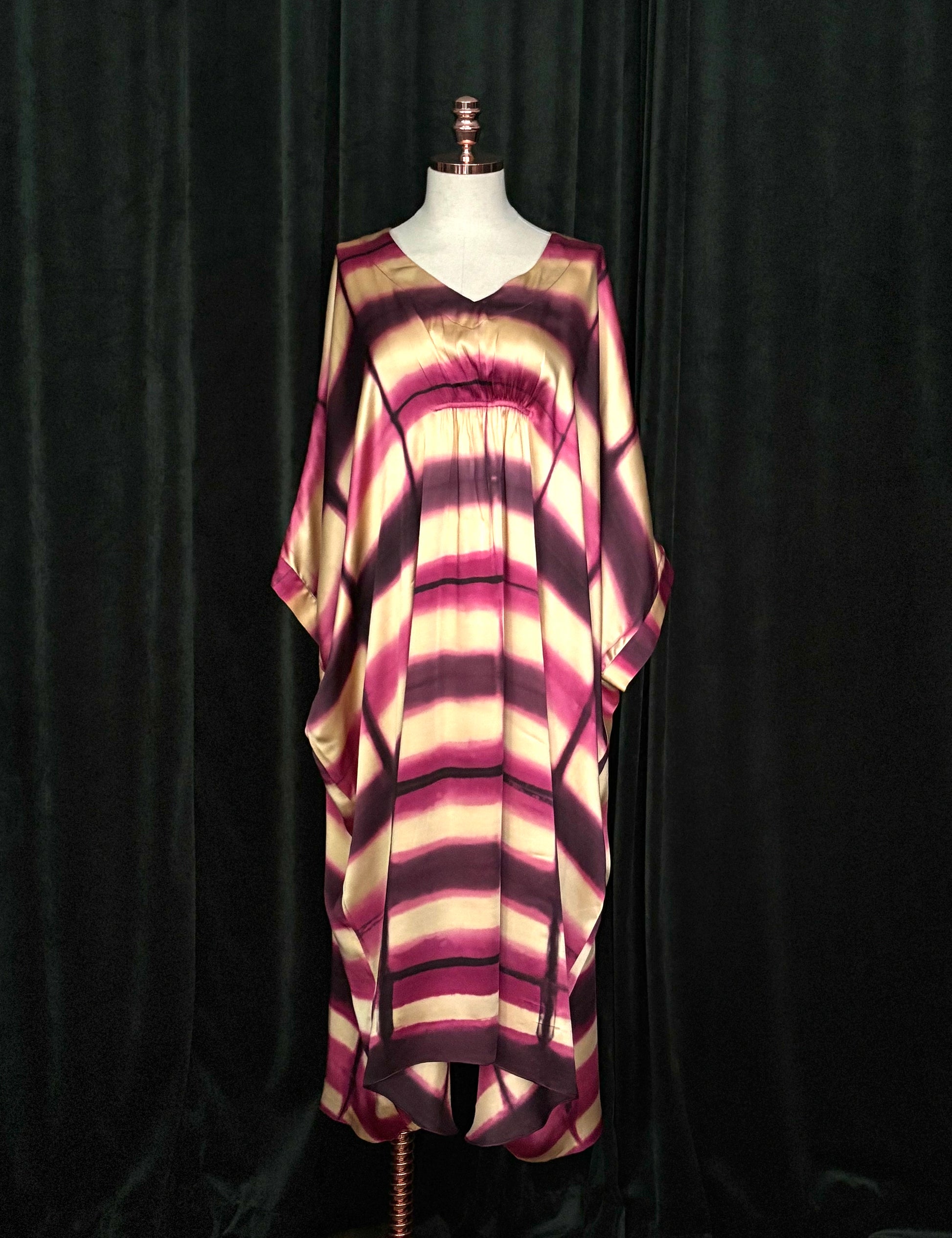 Kaftan em cetim de seda, com estamparia shibori inteiramente feita à mão — técnica ancestral japonesa que cria desenhos orgânicos e únicos através do tingimento artesanal. Cada peça é exclusiva, resultado de um processo lento e preciso que revela nuances sutis de cor e textura sobre o brilho delicado do cetim. O corte fluido, de linhas amplas e elegantes, valoriza o movimento e o cair perfeito da seda, criando uma presença serena e sofisticada. Uma peça de arte têxtil contemporânea, destinada a mulheres que apreciam o luxo discreto do feito à mão e a autenticidade das tradições artesanais.