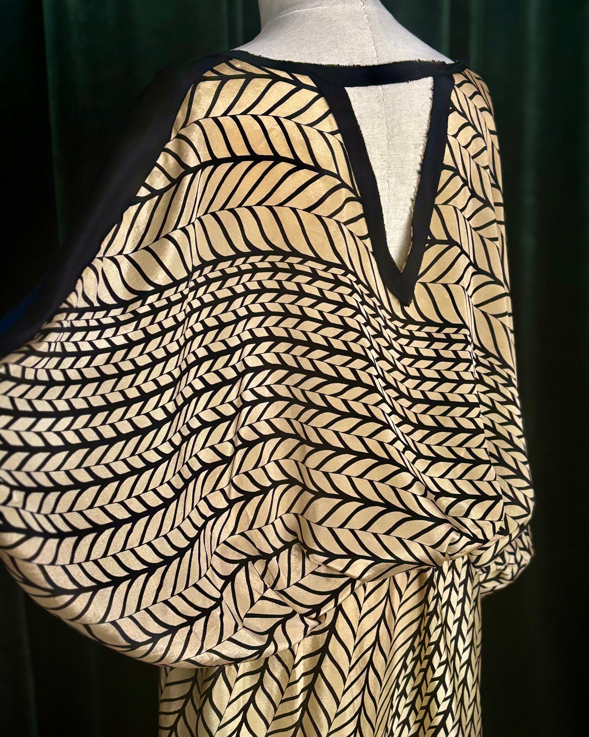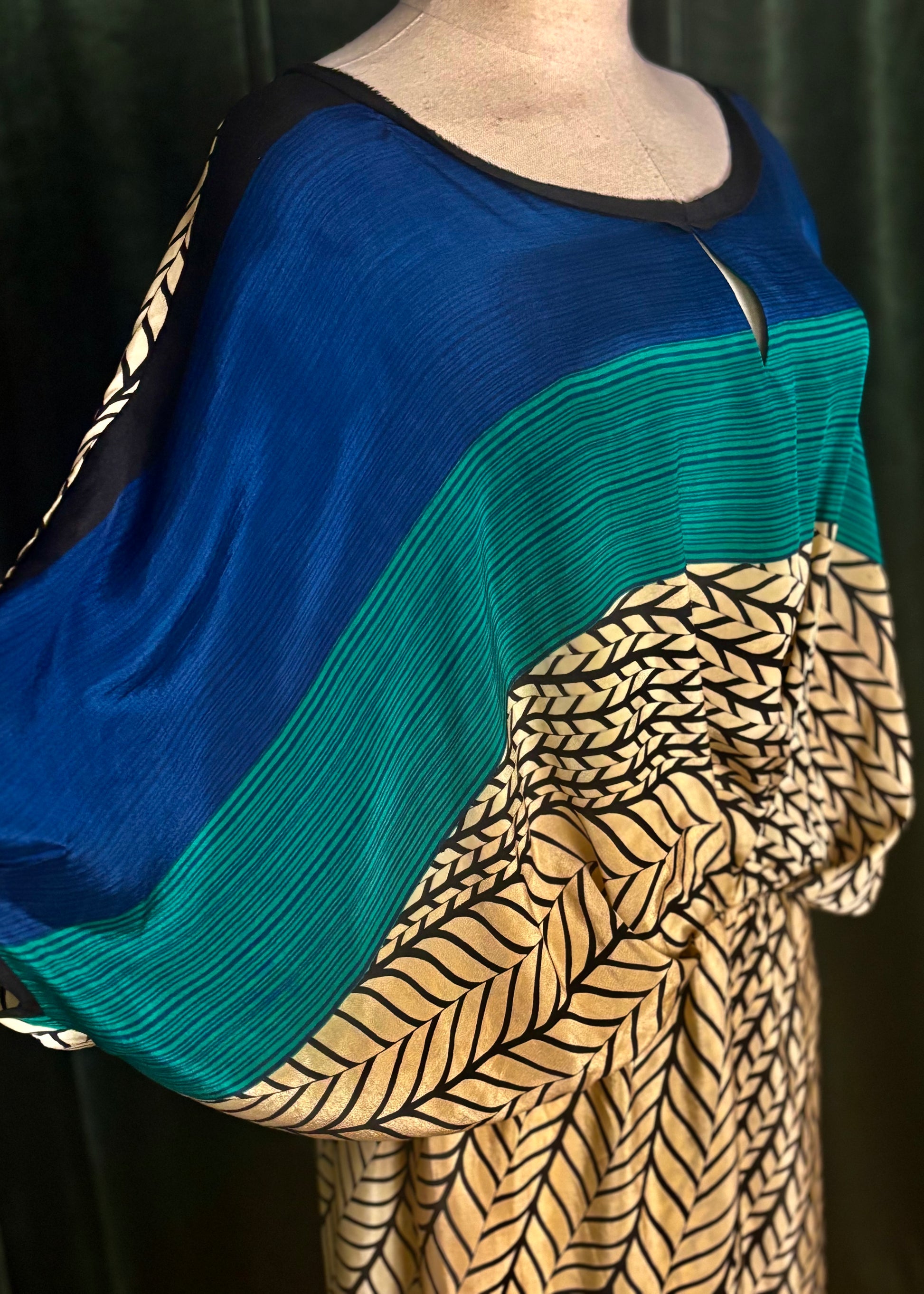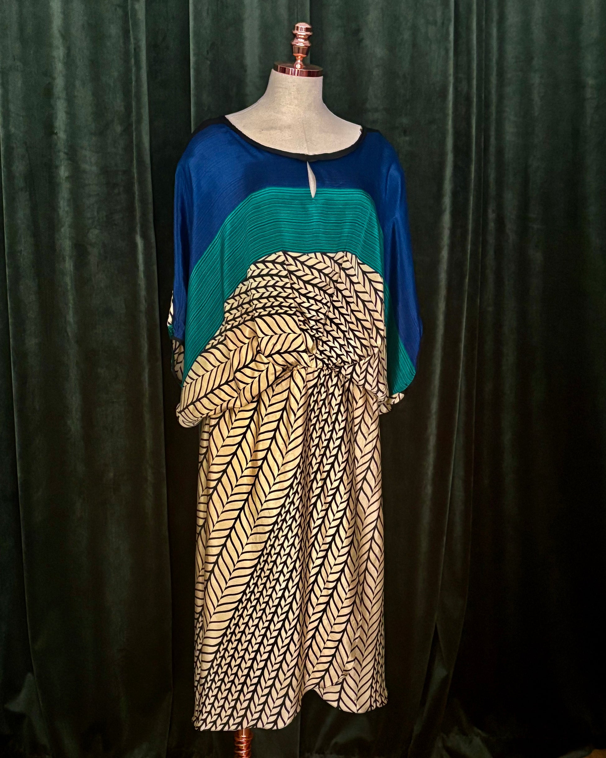 Criado a partir do meu acervo pessoal de saris de seda pura — cada peça é única, tecida com história e transformada manualmente em um novo formato. As estampas geométricas, originalmente desenhadas para saris indianos, ganham nova vida em um corte leve e fluido que valoriza o movimento e o brilho natural da seda. Um trabalho de ressignificação que une tradição, raridade e arte têxtil em uma criação exclusiva, feita para quem reconhece o valor do que é realmente singular.